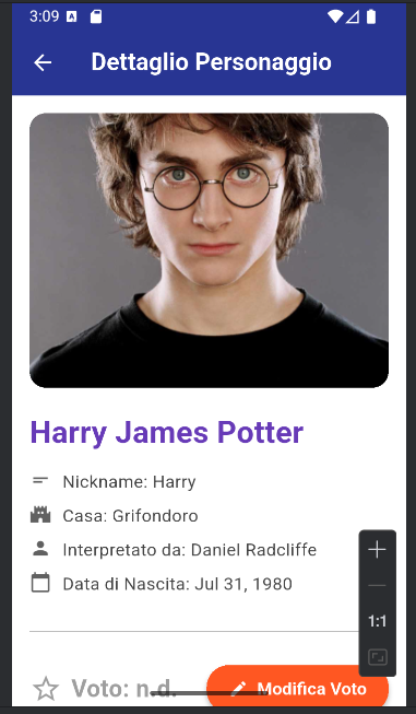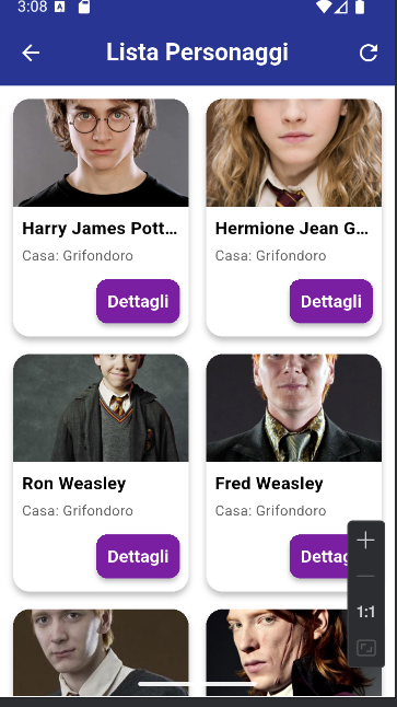 riporta la lista personaggi, per ogni personaggio vi è una foto di ogni personaggio, sotto la foto è inserito il nome e il cognome del personaggio e la casata di appartenenza, cliccando il pulsante dettagli possiamo trovare più informazioni rispetto al personaggio e accediamo alla terza schermata.